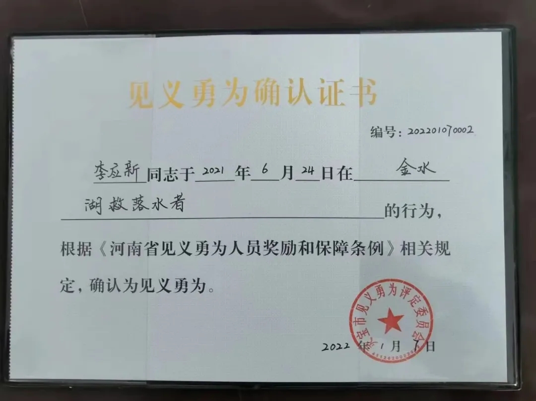 2021年6月24日晚上,一名女性在金水湖不慎落水,李應新奮不顧身躍進水中,成功将落水者救上岸,用實際行動譜寫了一曲新時代的正氣歌。